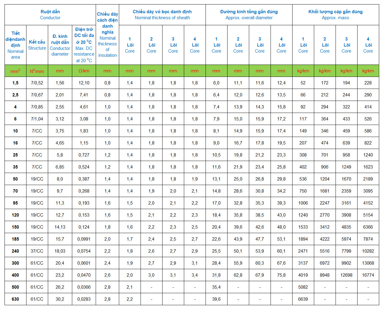 ĐẶC TÍNH KỸ THUẬT CỦA DÂY CVV- 1C ĐẾN 4C