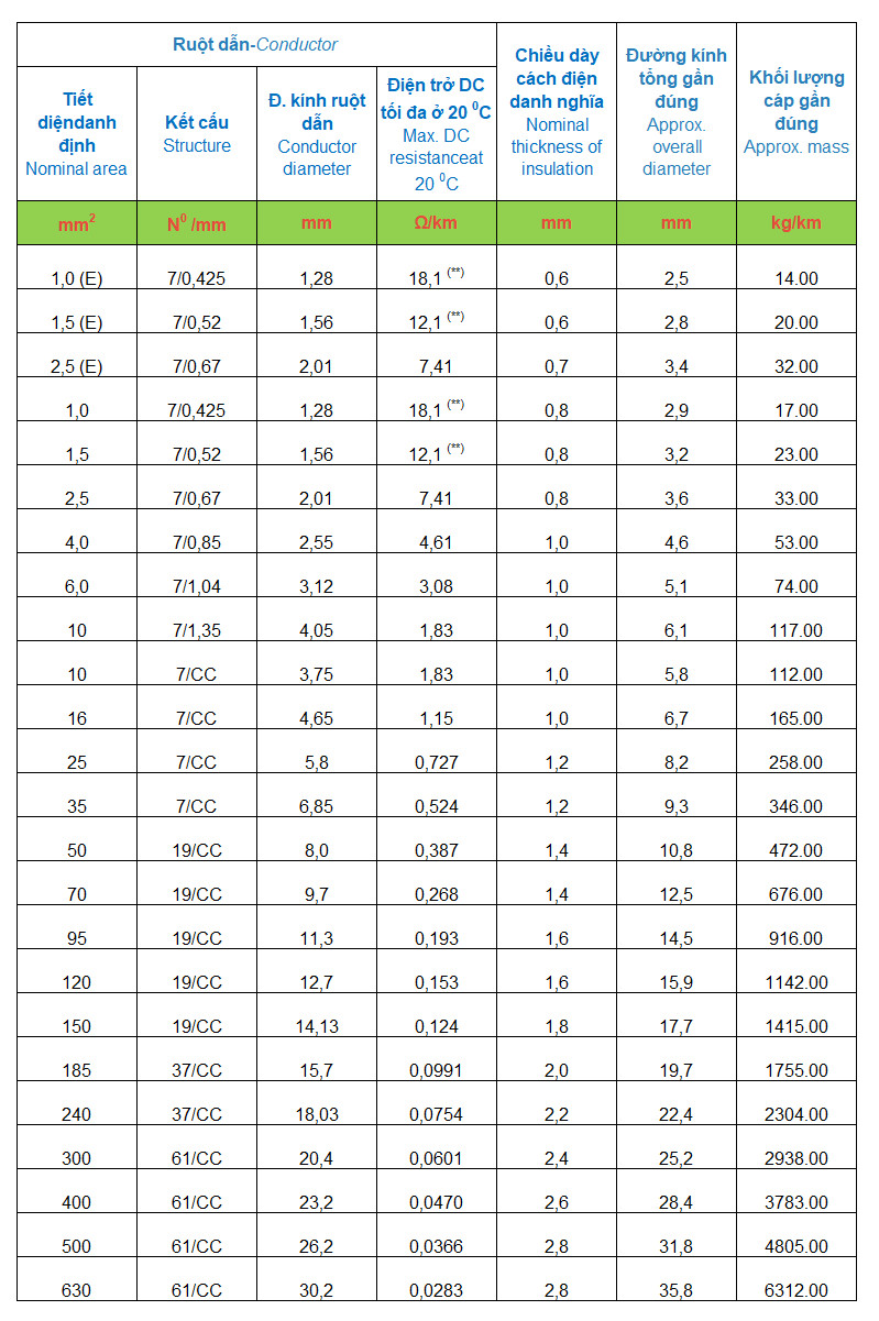 - Giá trị tham khảo: để phục vụ cho công tác thiết kế, vận chuyển, lưu kho sản phẩm. Không phải là chỉ tiêu đánh giá chất lượng sản phẩm.CC Ruột dẫn tròn xoắn ép chặt - Circular Compacted Stranded Conductor