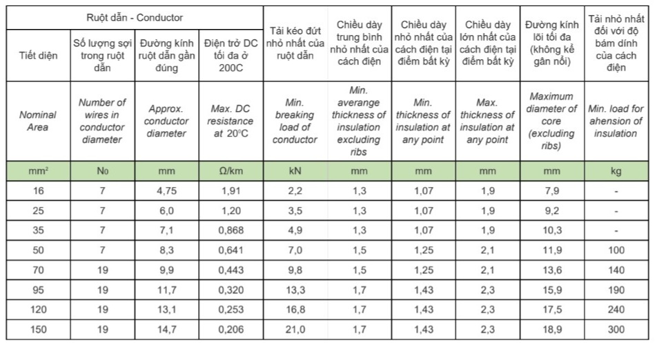 ĐẶC TÍNH KỸ THUẬT CỦA 1 LÕI CÁP - TECHNICAL CHARACTERISTICS OF CABLE 1 CORE.