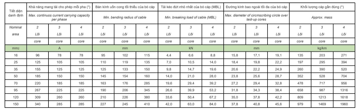ĐẶC TÍNH KỸ THUẬT CỦA 2,3,4 LÕI CÁP - TECHNICAL CHARACTERISTICS OF CABLE 2,2,3 CORE.